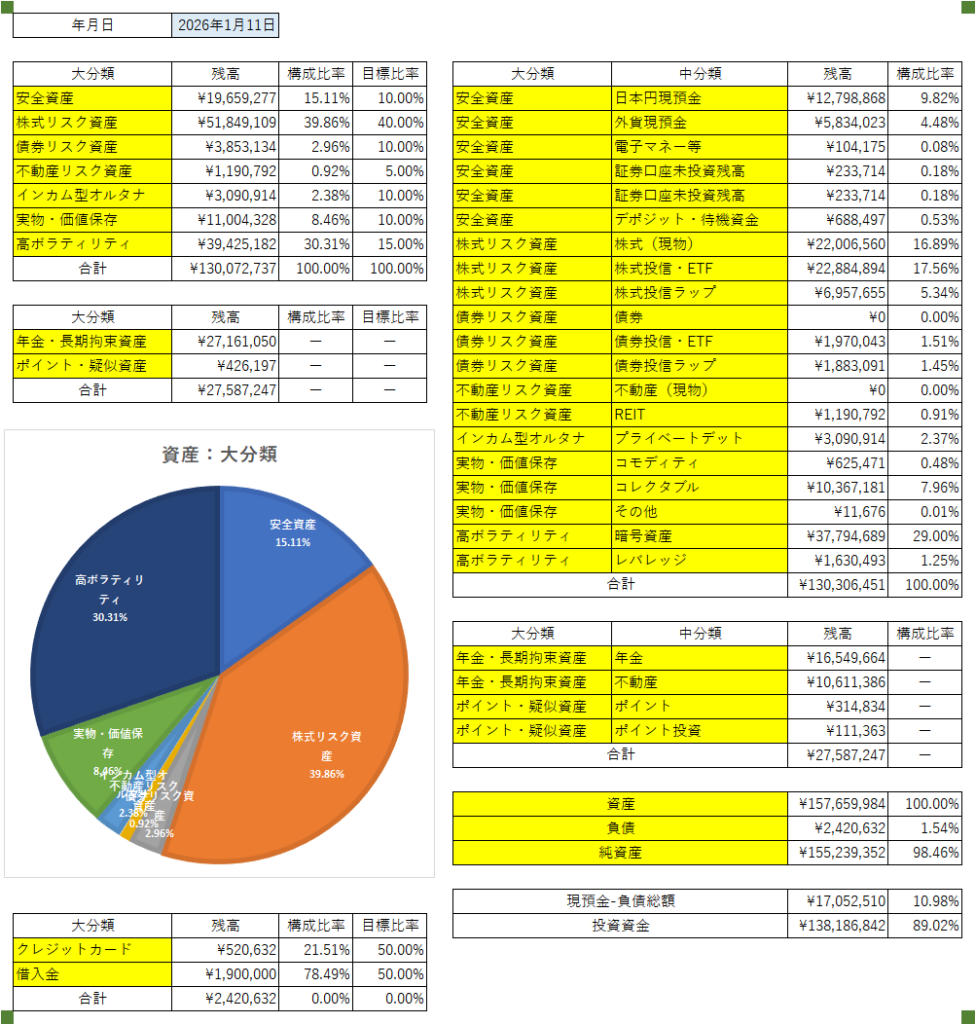 2026年01月11日現在の資産状況はこんな感じです。目標からはかなりかけ離れていますね。