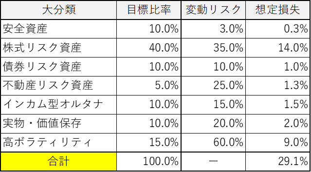 - 各アセットの比率×下落幅から、それぞれのアセットの比率を調整。