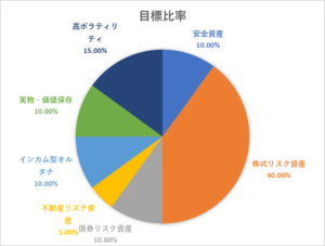 現状比率の大きい高ボラティリティ資産は少し大きめにしています。本来であれば、5%程度が望ましいのだと思いますが、そこまでのリバランスは現時点では不可能ですので・・・。