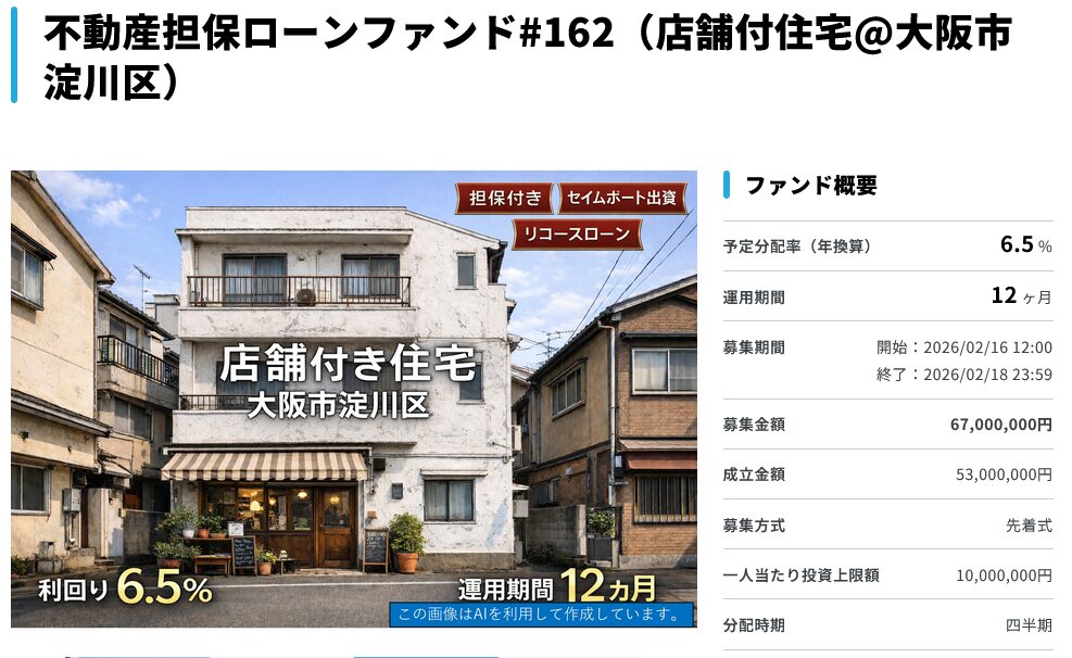 • 案件名:不動産担保ローンファンド#162(店舗付住宅@大阪市淀川区)