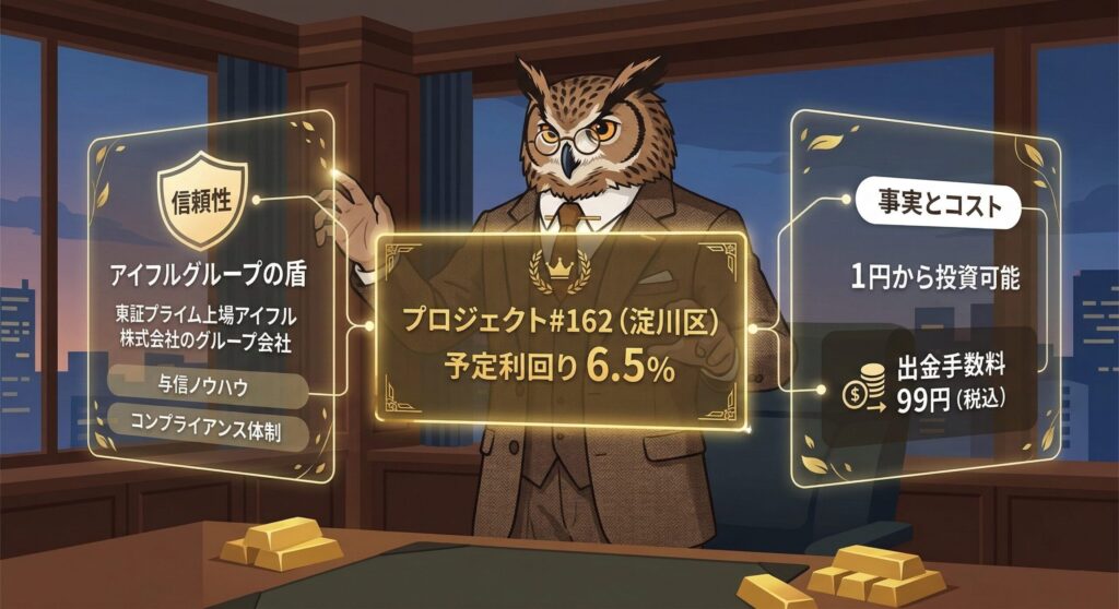 ホー、理事長。プラットフォーム選びにおいて、AGクラウドファンディングが東証プライム上場のアイフル株式会社のグループ企業であるという事実は、一つの安心材料にはなりますな。グループが長年培った与信ノウハウやコンプライアンス体制が背景にある点は、独立系のプラットフォームと比較した際の客観的な特徴と言えますぞ。