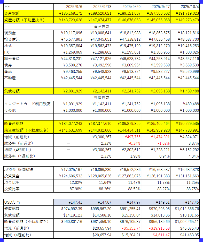 - 株式:40万円程度のマイナス。今回は日本株が約33万円、米国株が約7万円のマイナスです。日経平均は最高値更新ですが、私のポートフォリオはあまり恩恵をいただけなかったですね。また、米国株も微妙な感じです。政府機関の一時閉鎖の影響などでしょうか。