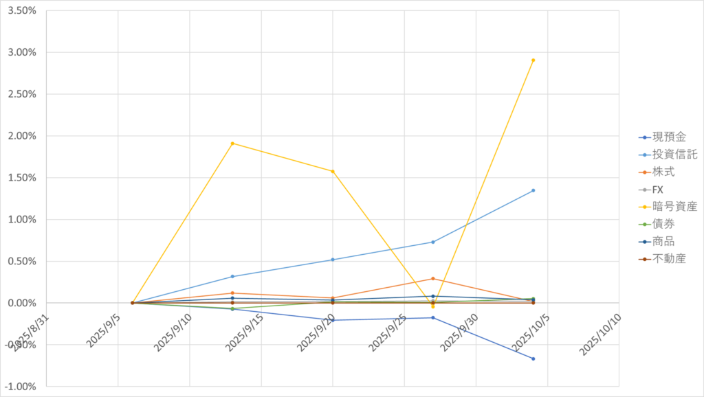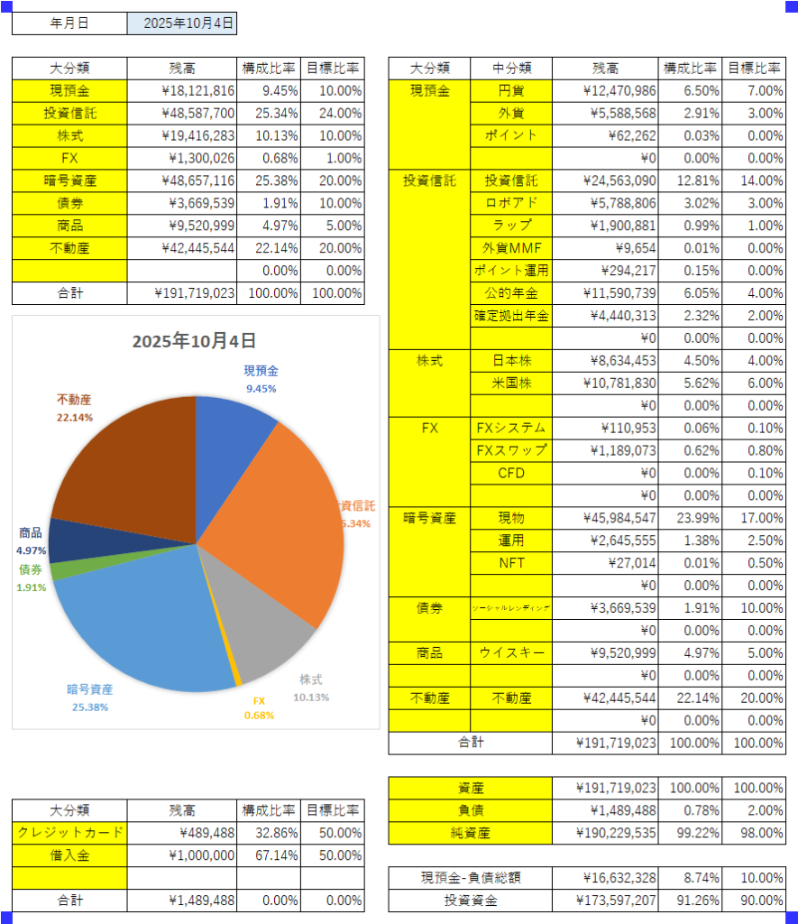 現預金の目標比率は10%±5%です。許容範囲ではありますが、少し心配になってきました。 - 資産クラスとして大きいものが、「投資信託」、「暗号資産」、「不動産」です。