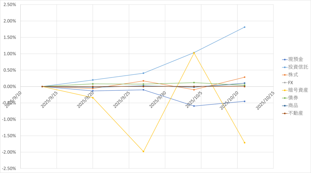 現預金の目標比率は10%±5%です。教養範囲内ですが、やはり少し現預金が心もとない感じがしています。 - 資産クラスとして大きいものが、「投資信託」、「暗号資産」、「不動産」です。良い感じの資産配分ではあるのですが、目標値とのずれが少し目立ってきましたね。
