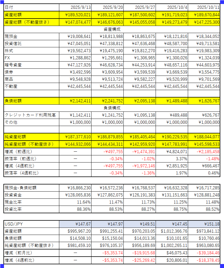 - 暗号資産:暗号資産は-400万円。ボラティリティが高いのは仕方ないのですが、前回分のプラスをそっくりそのまま吐き出す形となりました。週の途中まで、というか昨日まではプラスで推移していたので、600~700万円分くらいが数十分で下落した感じです。