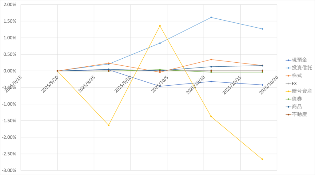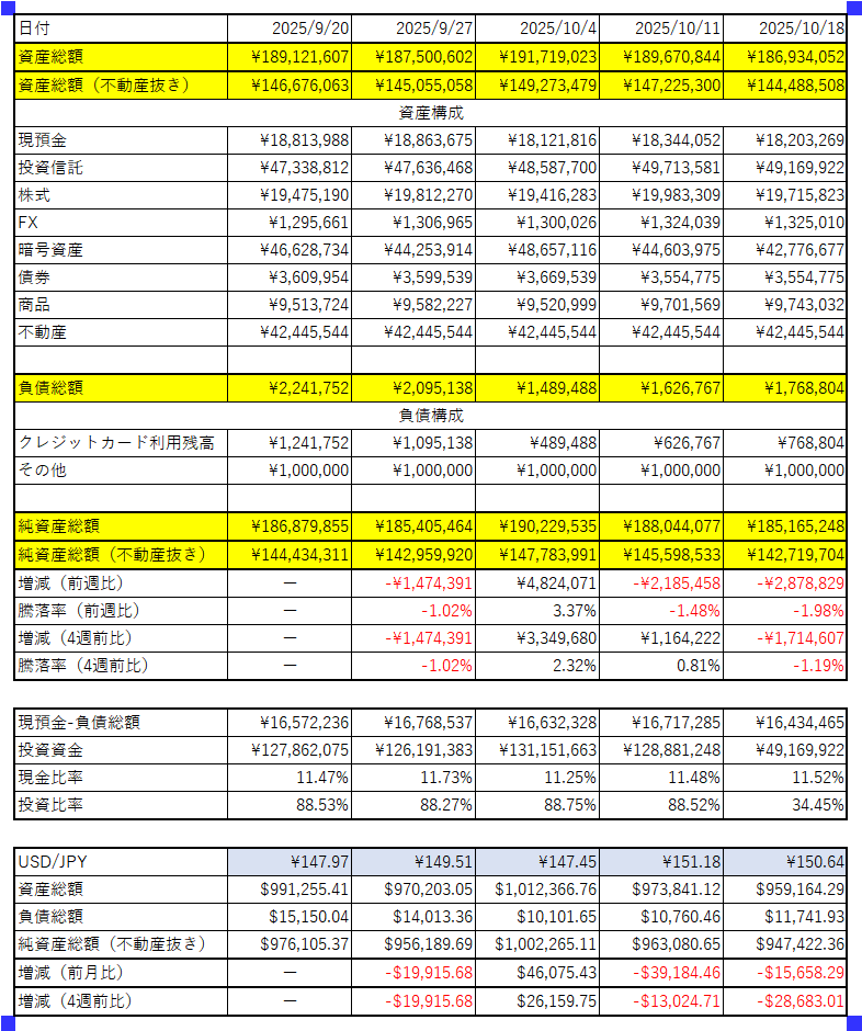 - 暗号資産:暗号資産は-180万円。前回に引き続きの下落ですが、今回は米中関係の悪化懸念によるリスクオフもあるのでしょうが、いちばんはUSDeのデペッグによる暗号資産全体への信用低下だと思います。どうしようもないですね・・・。
