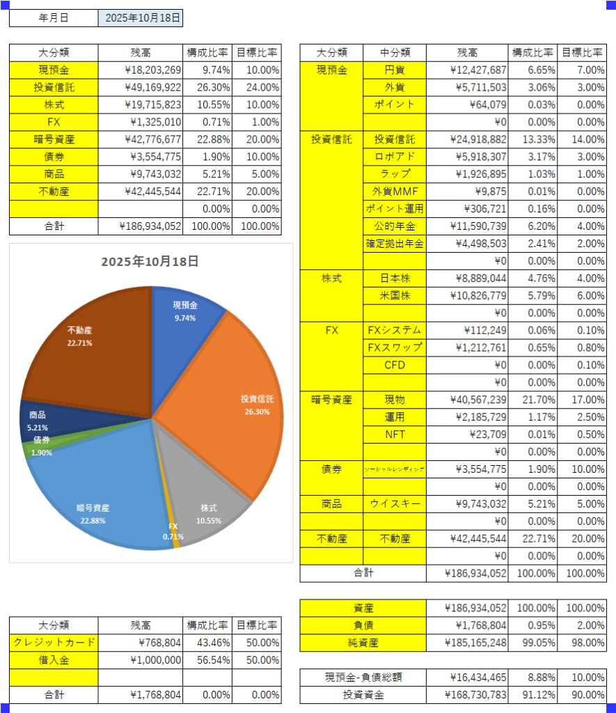 現預金の目標比率は10%±5%です。許容範囲内ですが、やはり少し現預金が心もとない感じがしています。 - 資産クラスとして大きいものが、「投資信託」、「暗号資産」、「不動産」です。良い感じの資産配分ではあるのですが、債券・ソーシャルレンディングの割合がなかなか上昇しません。