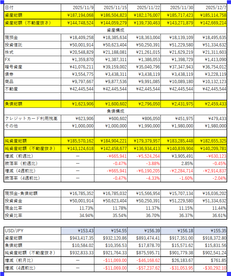 - 純資産:円ベースでは-60万円、ドルベースでは+800ドルです。先週から一転反落となりました。ただ、ドルベースでは微増というかほぼ現状維持です。
