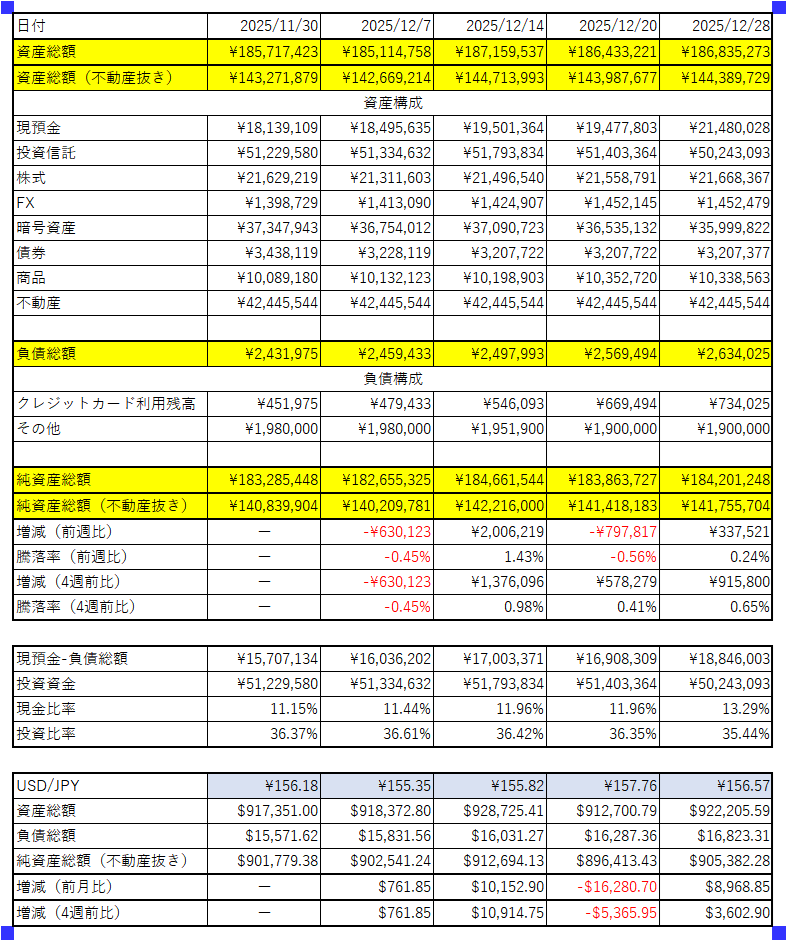 - 株式:+11万円程度。日本株が+6万円、米国株が+5万円程度です。日米ともに上昇しています。この調子で大納会も行ってほしいものです。