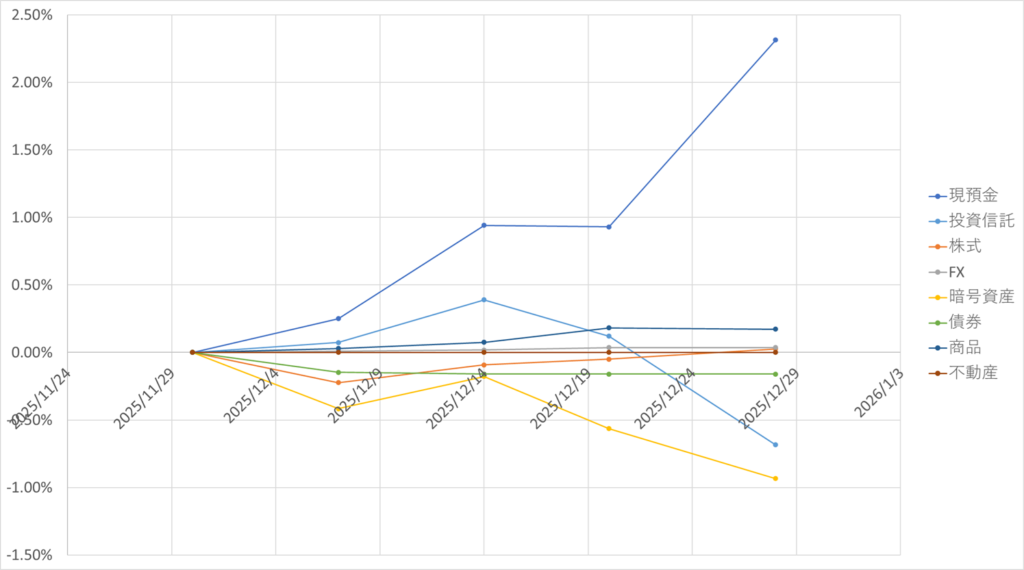 - 暗号資産:暗号資産は-50万円。やはり調子が悪いですね。致し方ないところですが、来年に期待ですね。