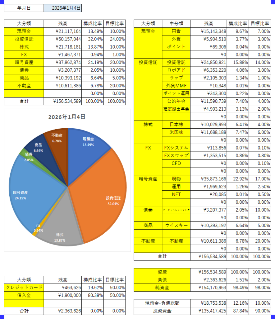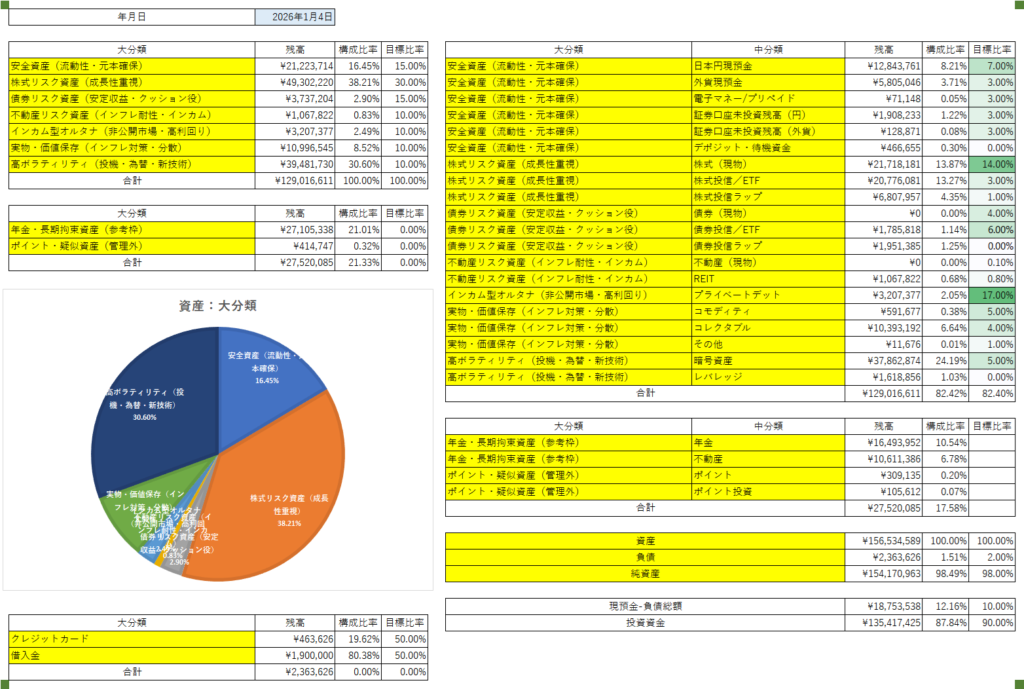 2026年最初の資産公開でした。今回から分類方法を変えたり、対象外を追加することで、実際に即した状況把握ができるようになったのではないかと思います。しばらくは昨年同様の管理と並行して実施しつつ、様子を見ながら切り替えていきたいと思います。
