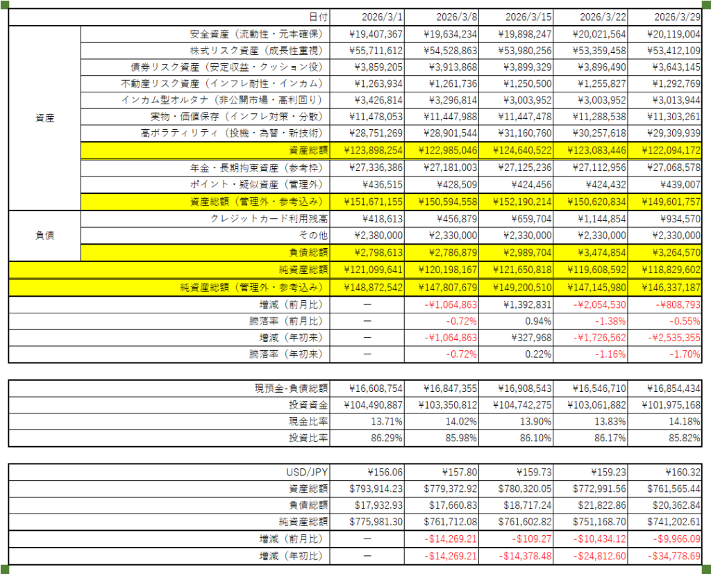 週次の推移を振り返ると、3月15日に一時的な回復(純資産149,200,509円)を見せましたが、それ以外は概ね右肩下がりの展開が続きました。