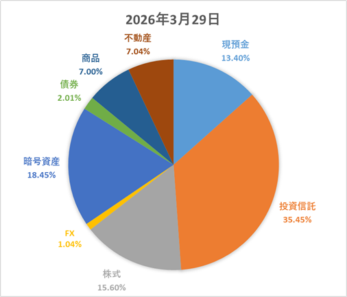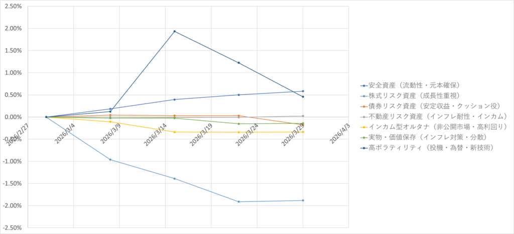 主力のBTC(ビットコイン)を中心に、月中盤の3月15日前後には一時的な持ち直しの動きがありました。高ボラティリティ資産の週次残高を見ると、3月8日の28,901,544円から3月15日には31,160,760円まで回復しています。しかしそこが一時的な天井となり、3月末には29,309,938円まで再び下落しました。
