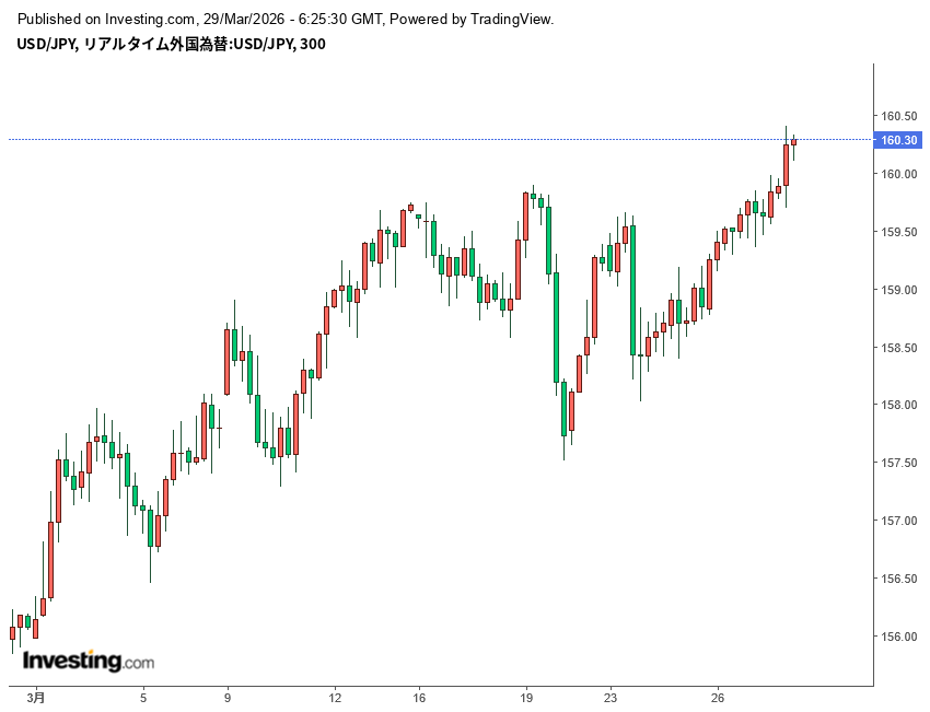 3月1日時点で156.06円だったUSD/JPYは、3月29日には160.32円まで上昇。約1ヶ月で4円超の円安進行です。