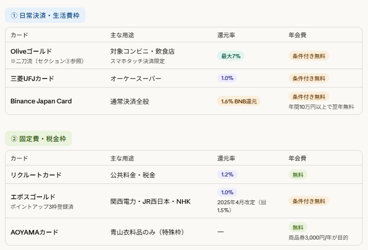 今回は、この11枚の用途別最適化の全貌と、リアルな還元率の事実を公開します。