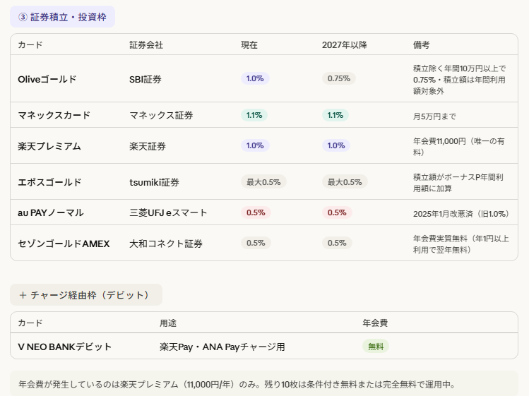 | カード | 証券会社 | 現在 | 2027年以降の見込み | 備考 |