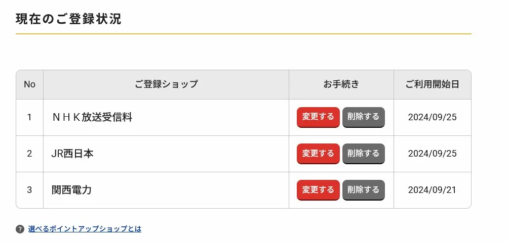 現在、当研究所では「関西電力(2024/09/21登録)」「JR西日本(2024/09/25登録)」「NHK(2024/09/25登録)」の3枠を設定しています。中でも年間約50万円を決済する関西電力(電気・ガス)が最大の効果枠となっており、登録前(0.5%)と比べると年間で+2,500Pの差分を生み出しています。