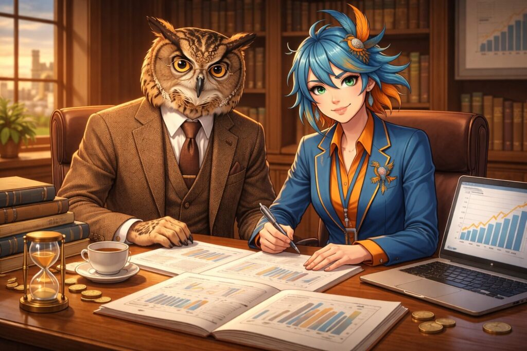 ホー、kanato理事長!複利とは、時間を資産に変える錬金術ですぞ。多くの方が「準備が整ってから始める」と先送りにしてしまいますが、準備とは運用しながら整えるものですな。確定拠出年金は年齢制限があるため、今日1日の先送りは後から取り戻せない機会損失になるのですぞ!