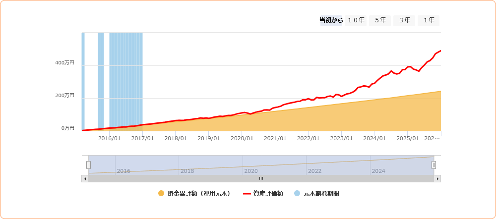 資産全体のリスクバランスを考慮し、一部の積立は調整していますが、基本的には長期積立を継続しています。