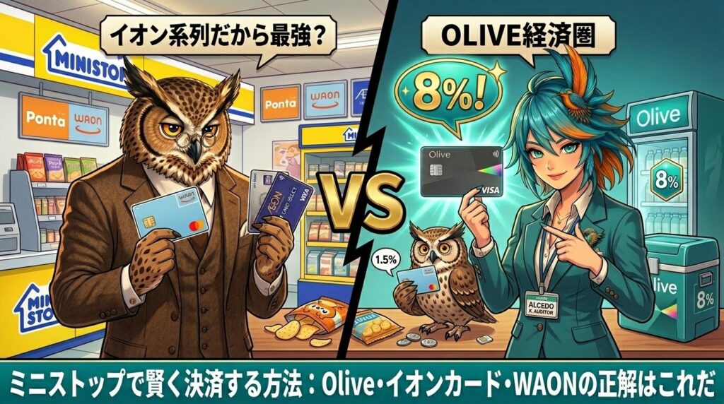ホー、コンビニシリーズ4本を通じて共通の結論が出ましたぞ。『カードの名前や経済圏に惑わされず、役職で選ぶ』。イオン系列のコンビニでイオンカードが1.5%、Oliveが8%という現実がそれを証明していますな!
