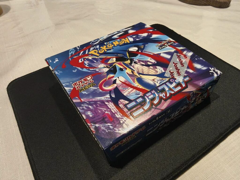 2026年3月13日に発売されたポケモンカードゲームMEGA拡張パック「ニンジャスピナー」。表紙を飾るのは、国内外で圧倒的な人気を誇る〈メガゲッコウガex〉です。発売後も高値で取引が続くMUR仕様への期待を胸に、Joshinで入手した1BOX(¥5,400)を全30パック開封しました。