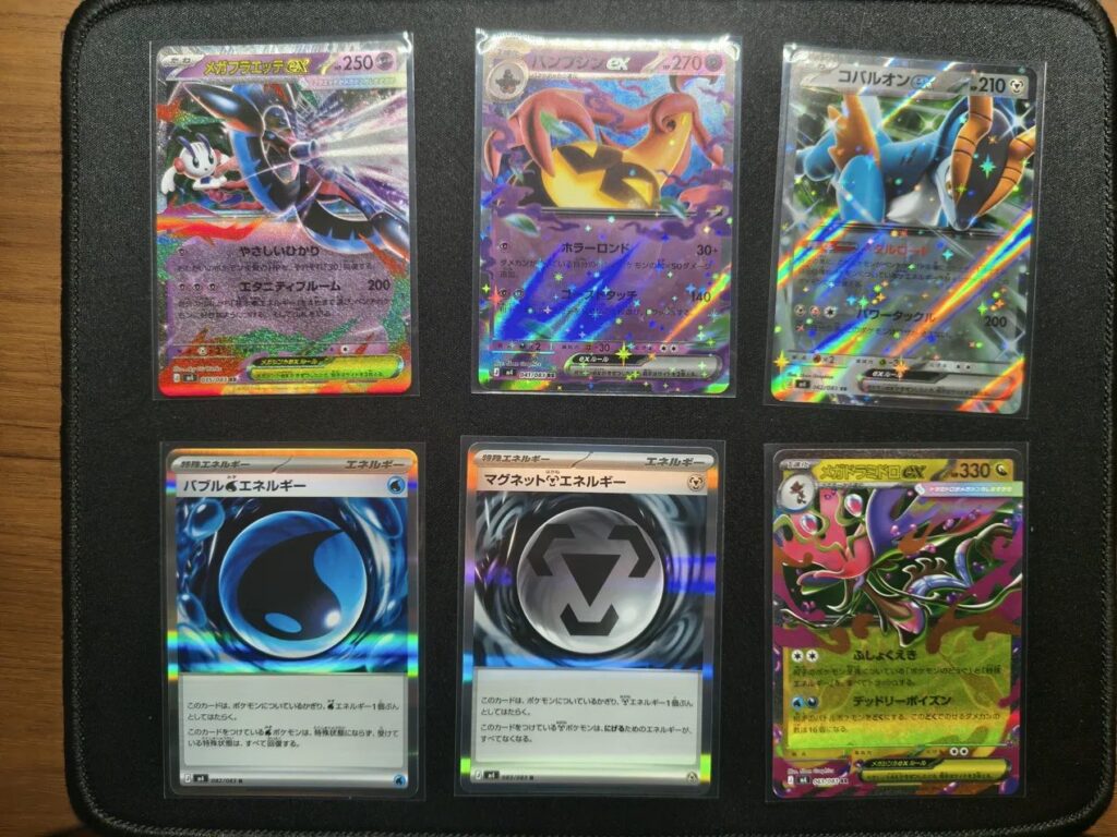 RRは4枚:メガドラミドロex・コバルオンex・パンプジンex・メガフラエッテex。エネルギーRはマグネット鋼エネルギー・バブル水エネルギーの2枚でした。RRはいずれも流通量が多く、現時点では参考価格も低めに推移しています。