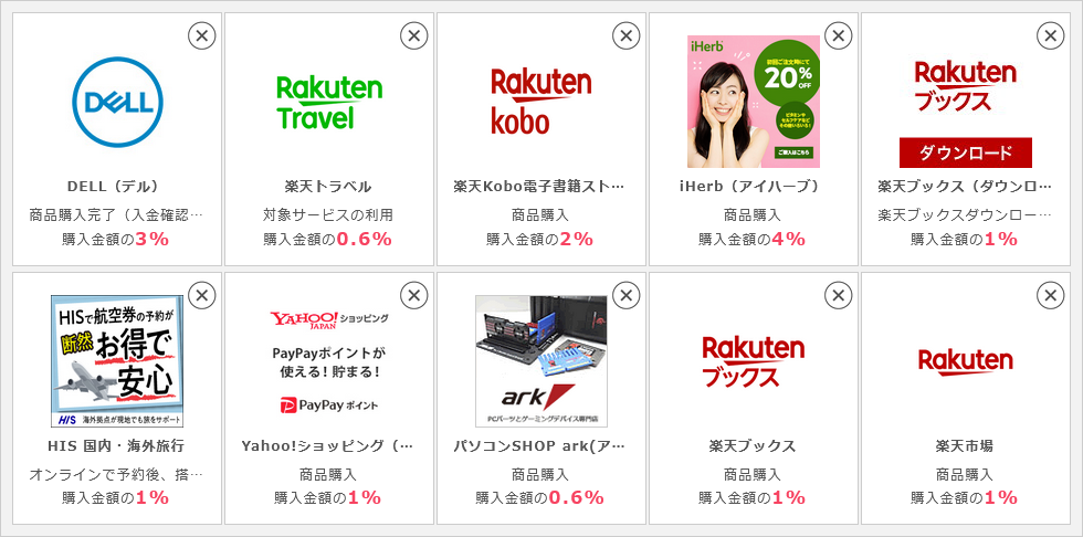 こちらが私がお気に入りに追加しているサービスです。楽天市場や楽天ブックスなどは、経由するだけで購入金額の1%程度が還元されます。