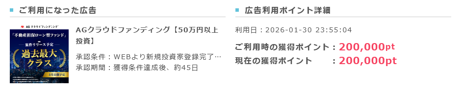 高還元ルートの起点となるクレジットカードの作成や、ソーシャルレンディングの口座開設もこちらを通します。 最近では、AGクラウドファンディングの口座開設案件などを利用しました。こうした「投資を始めるための準備」自体が、次の投資の原資を生み出す仕組みになっています。