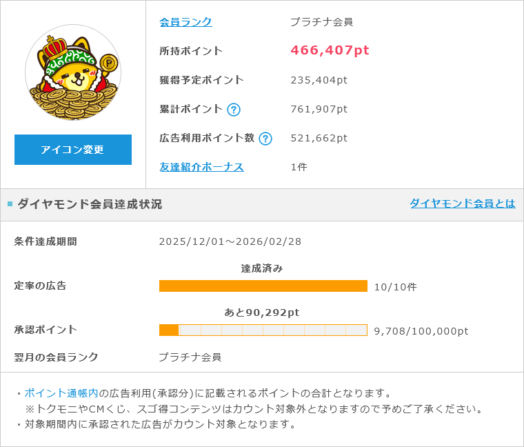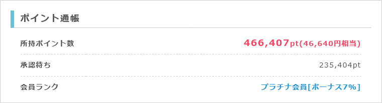 現在、承認待ちを含めて約23万pt以上を抱えており、最高ランクの「ダイヤモンド会員」への昇格も目前です。