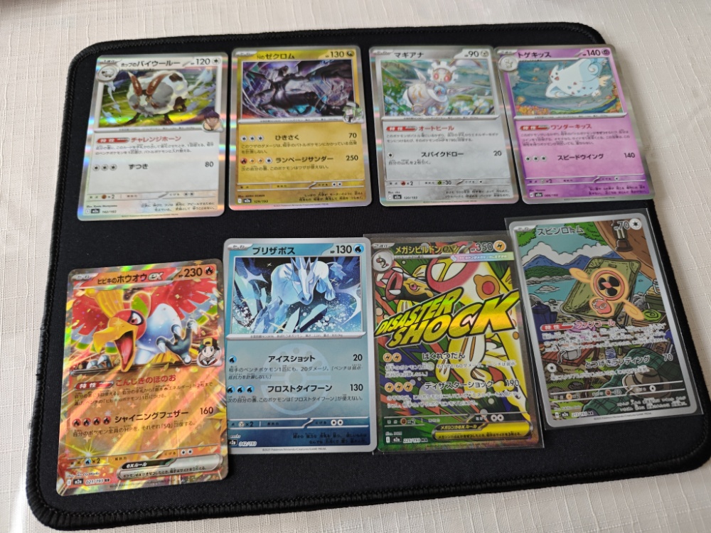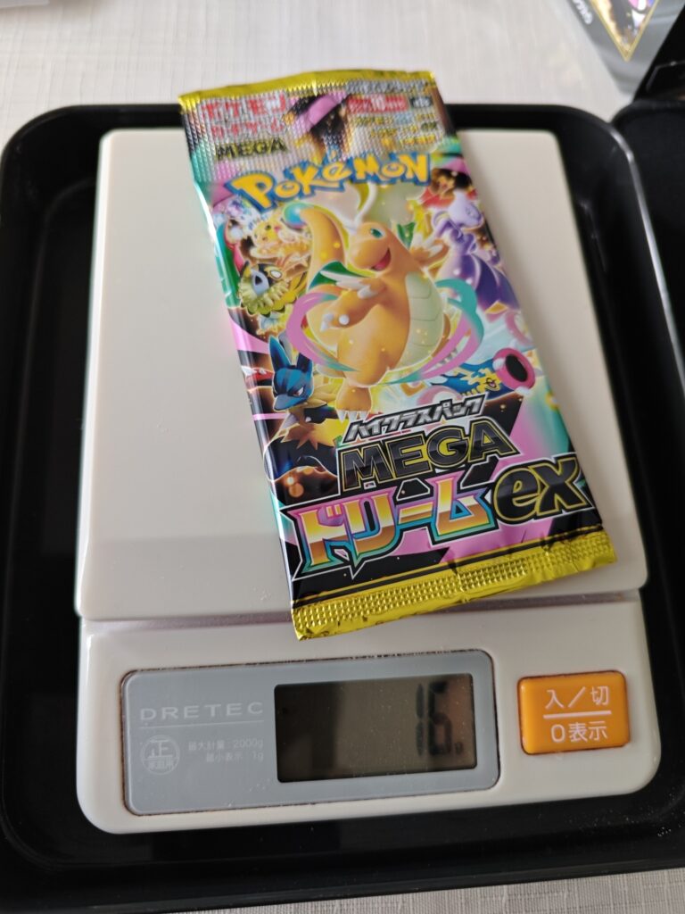 結果は「16g」と「17g」で、わずか1gの差がありました。開封したところ、16gからは「メガシビルドンex(MA)」、17gからは「スピンロトム(AR)」が排出されました。1g重かったパックの方がレアリティとしてはARに留まったという事実は興味深く、重量だけでは中身の価値を断定できないというリアリティのある検証データとなりました。
