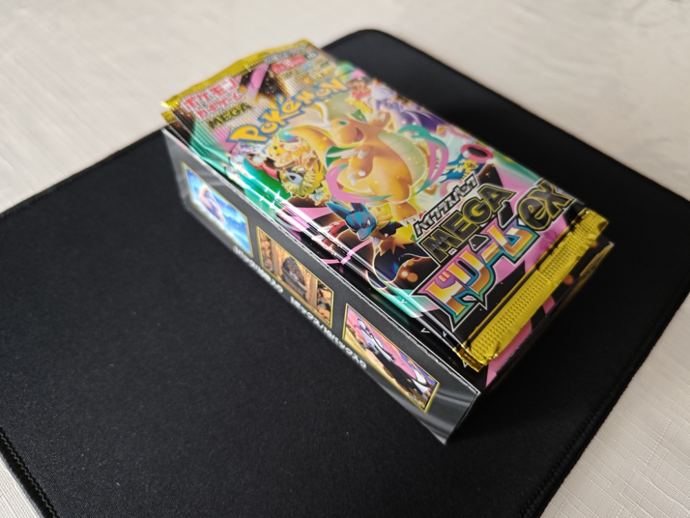 先日、ハイクラスパック『MEGAドリームex』の抽選販売に当選し、1ボックスを定価(5,500円)で入手できました。さらに帰りがけのコンビニでバラ売りの2パック(1,100円)を追加購入できたため、計6,600円分の開封検証となります。 数年後の値上がりを期待して未開封で寝かせる選択肢もありましたが、今回は新レアリティの封入率や期待値を確認するため、すべて開封して中身を詳しく見ていくことにしました。