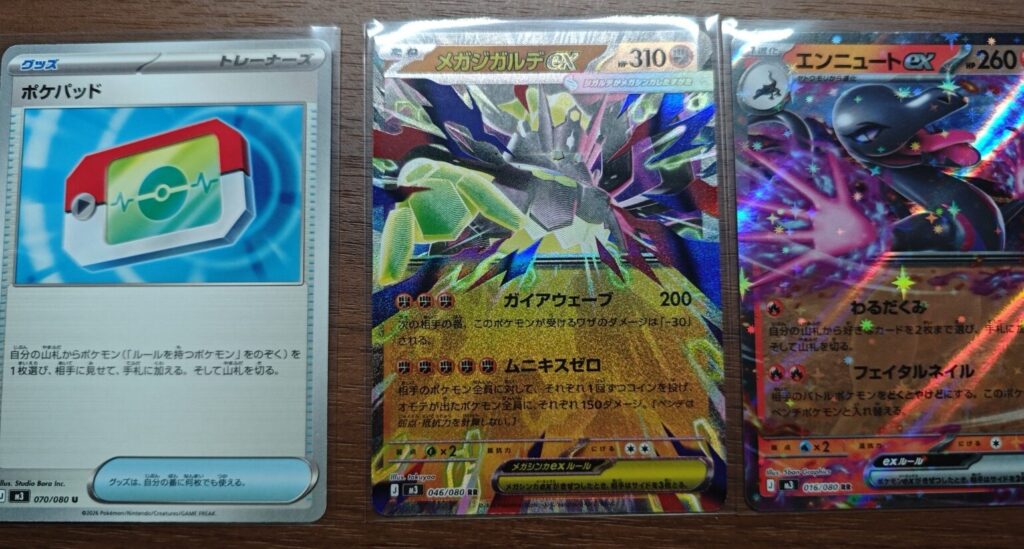 一見ただのアンコモン枠に見えますが、こいつが実は意外な実力者。プレイヤー需要が高く、現在のメルカリやショップ価格では230円〜320円ほどで取引されています。なんと、今回引いたどのex(RR)よりも高い!300円のカードを見て「よし、これで傷が浅くなったぞ!」と本気で安堵する。このシュールな状況こそ、ポケカ開封の面白さですね。
