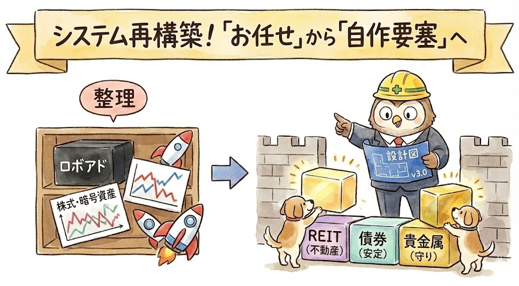 私の資産運用システムが、今回一つの大きな転換点を迎えました。 これまでは「資産形成期」をv1.0、「拡大期」をv2.0とするならば、現在は資産を守りながら育てる「堅牢化フェーズ」であるv3.0へのアップデートと自分なりに定義しています。