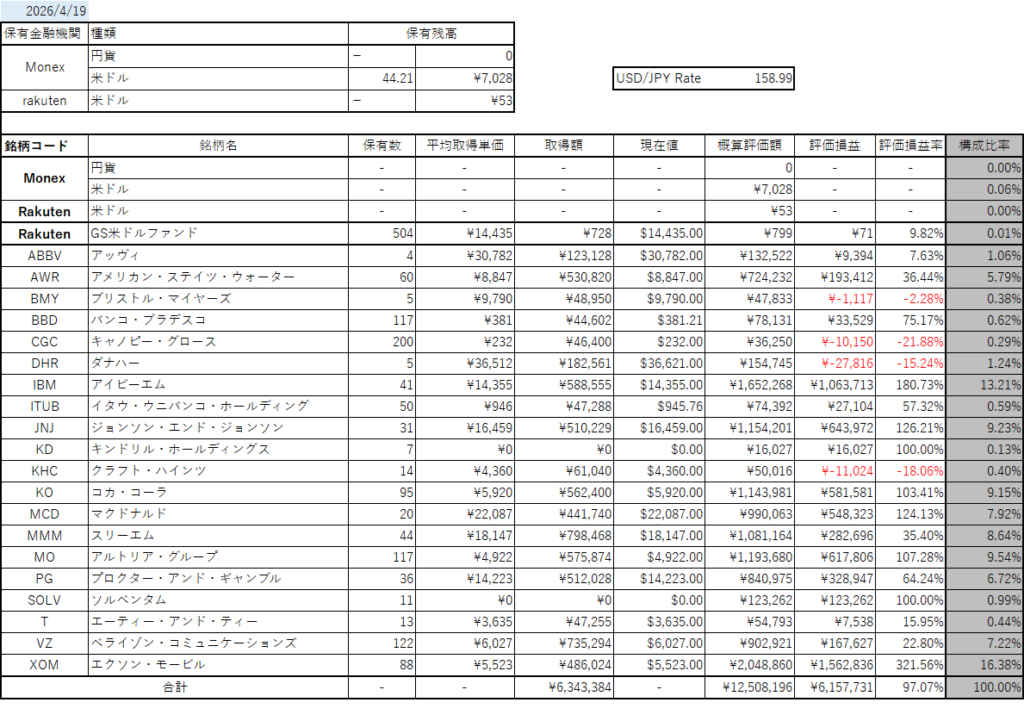 2026年4月19日時点(USD/JPY=158.99)、米国株式のポートフォリオは下記のようになっています。